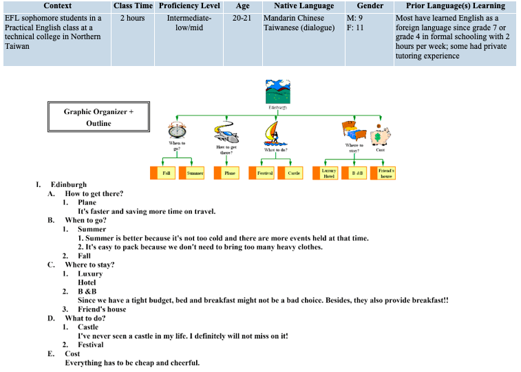 To provide EFL teachers with concrete lesson planning, Figure 2 further shows a screenshot of one of the WebQuest lesson components that demonstrates how EFL teachers can teach students to organize their itinerary through the Inspiration graphic organizer software (http://www.inspiration.com). Each lesson lays out the progression of activities in relation to the WebQuest site supported by multimedia technology, content and language objectives (e.g., understanding the specific language used in the travel sites), materials needed (e.g., Inspiration software) and target strategies (e.g., metacognitive and social strategies). This detailed version of the WebQuest lesson plan is intended for a Taiwanese technical college EFL class and can be accessed at https://goo.gl/N2YJqJ.